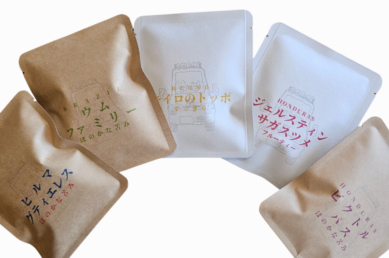 簡単にドリップコーヒーが楽しめるドリップバッグ。 キャンプ、出張先で、プレゼント、簡単にコーヒーを淹れたい時などに重宝すると思います。 種類違い5個セットの販売となります。